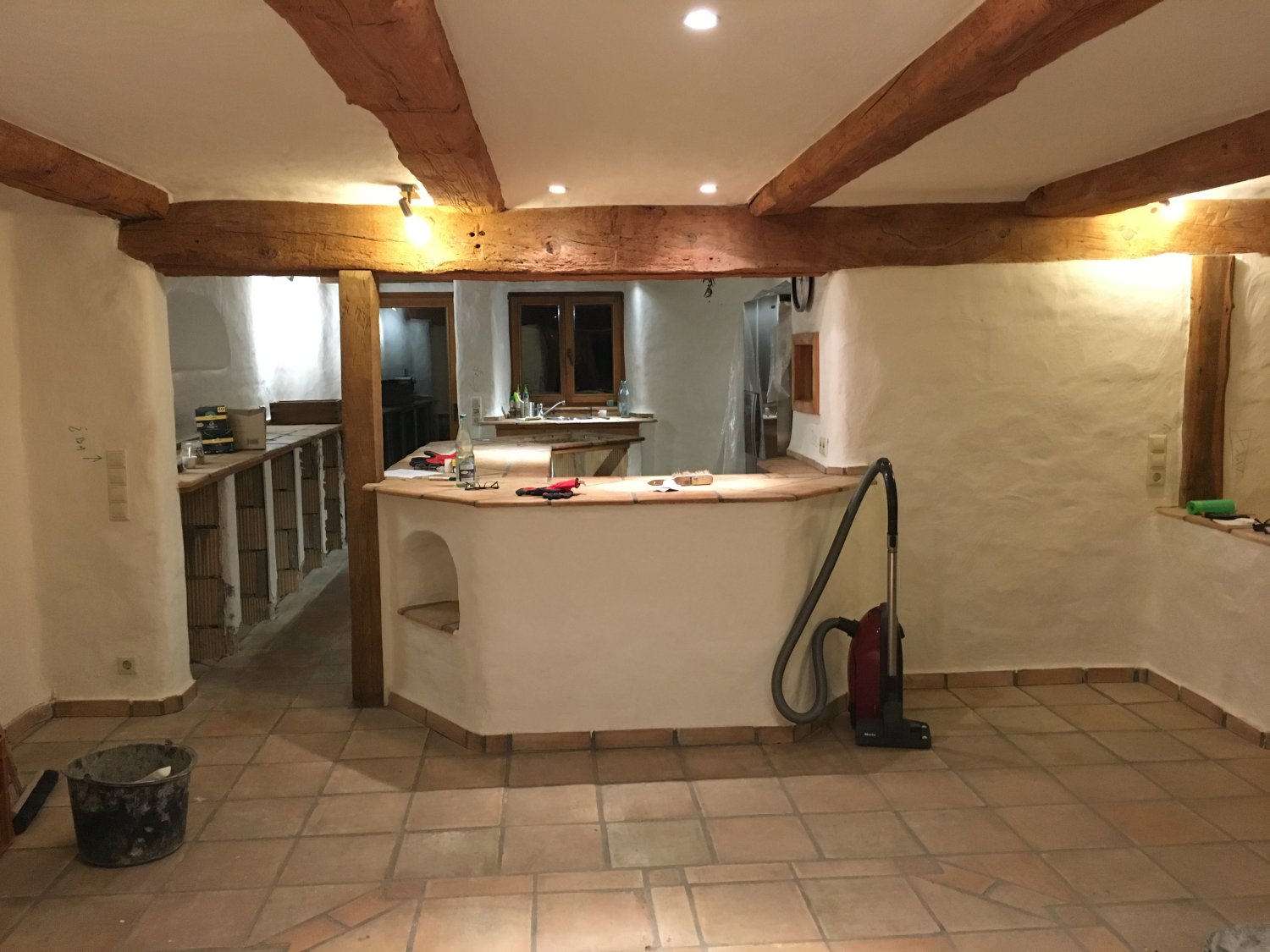 Im nächsten Schritt wurden in Wohn- und Esszimmer sowie in der Küche die gemauerten Möbel mechanisch herausgespitzt, Wände wurden geglättet, Wasser- und Elektroleitungen neu verlegt.